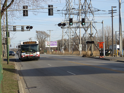 The large road is mostly empty. It has a city bus traveling down it. You can see a electrical station. You can also see traffic lights that are green. Along with telephone poles and city street signs.