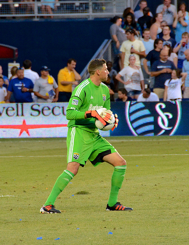 A man in a green uniform is holding a soccer ball. He is standing on the grass of a soccer field. There are people in the stands behind him watching the game.