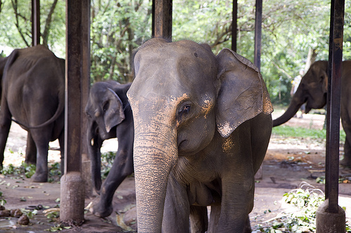 A group of small elephants under a covering. The elephant closest to the camera has brown spots on it's face and ear. There are three elephants behind the one closest to the camera. There is a forest of trees behind the elephants. There is a dirt and grass ground under the elephants.