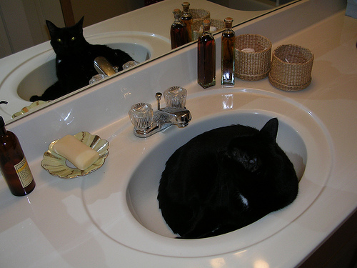 a cat is in the sink. the sink is white in color. the sink is ceramic. the cat has black fur. the cat has a white collar.