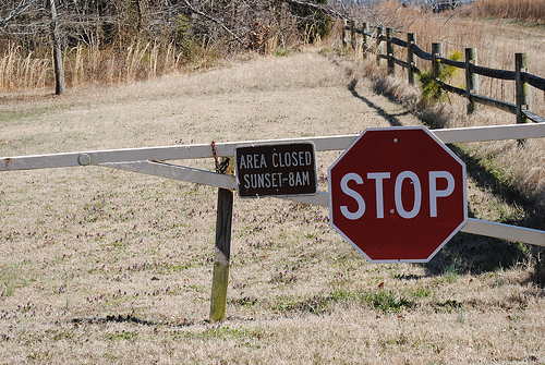 On the fence hangs a large STOP sign letting anyone approach no that you can just not glide through the open gate. The gate is now closed with a smaller sign that says AREA CLOSED SUNSET-8AM. The grass is so light that it almost looks like whet behind the gate. The gate seems to be made out of wood and the fence posts out of wood also.