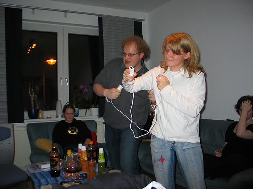There are two people playing a video game. They have controllers in their hands. One is male and one is female. There are other people in the room with them. It looks like a party.