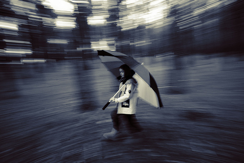A woman is walking outside with a large umbrella. The umbrella is black and very large. The handle of the umbrella is black. The woman has a black cover on her head. She is wearing a white jacket. The background is very blurry.
