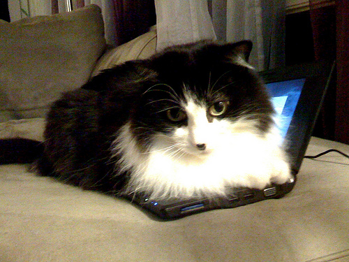 There is a black and white cat sitting on top of a laptop. The laptop is open and turned on. There is a gray couch under the laptop. There are curtains on the window behind the couch.