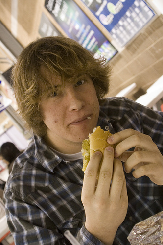 A man is wearing a black striped shirt. He is holding a sandwich in his hands. There is a blue sign on the wall.