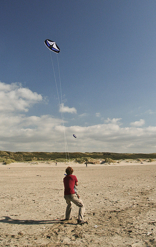 A man is being shown holding a kite that is far in the air. He has on a red tee shirt with khaki pants. The kite he is holding is white and blue. He is on the beach.