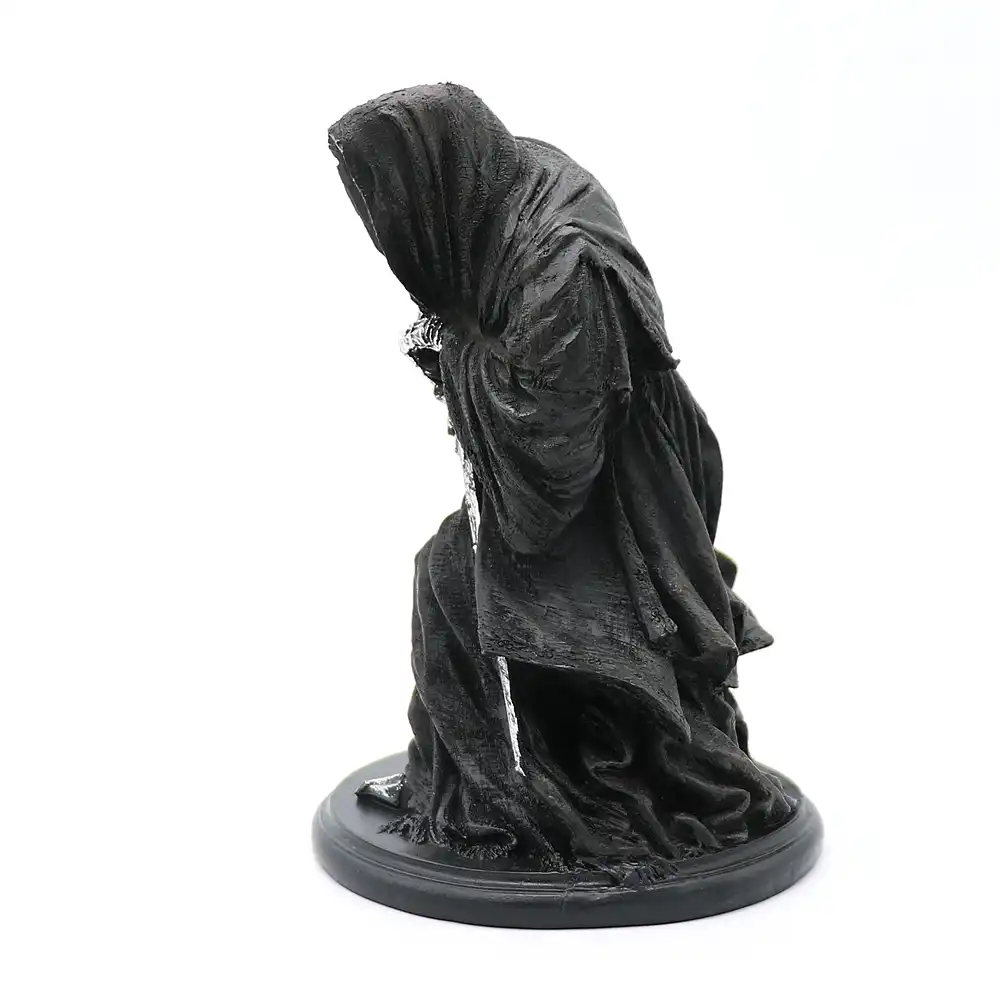 "text": " The image showcases a bronze statue with a unique design. It appears to be a modern abstract sculpture with a shiny metallic finish. The statue has a curved form with a smooth surface, giving it an elegant and sleek appearance. Its design includes a large, flat base that supports the main body of the sculpture."