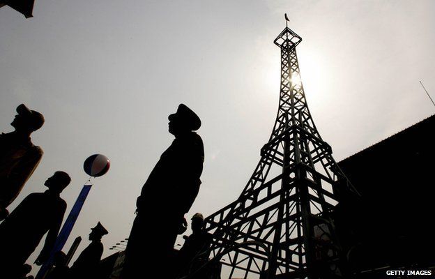 "text": "Bronze statue, tin can, and copper pipe arranged on a wooden surface with a reddish hue."