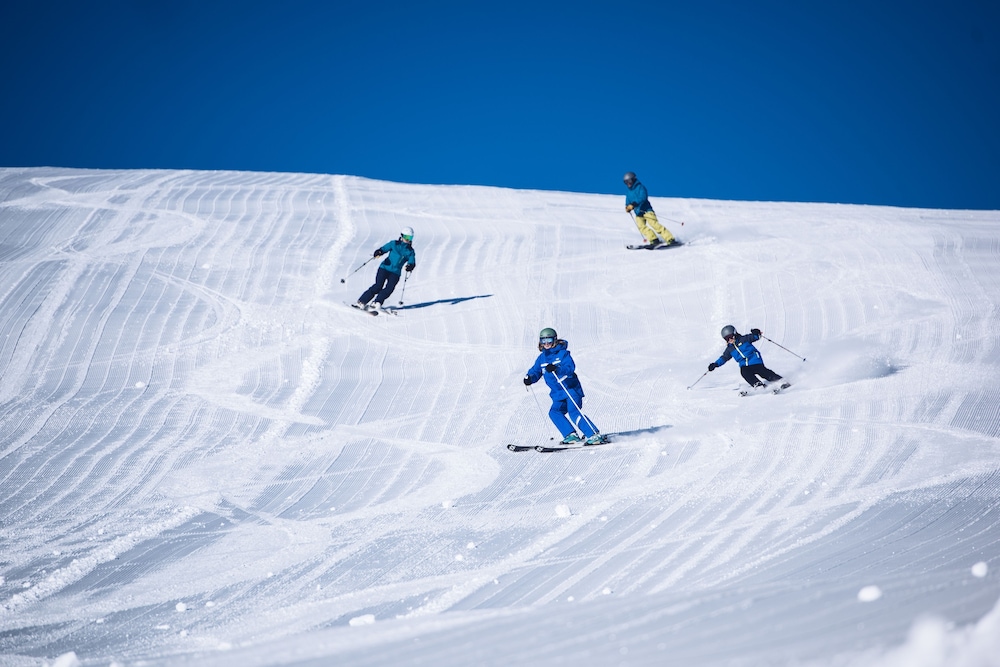 Four skiers descend a snowy hill under a blue sky, with tracks from previous skiers on the slope.