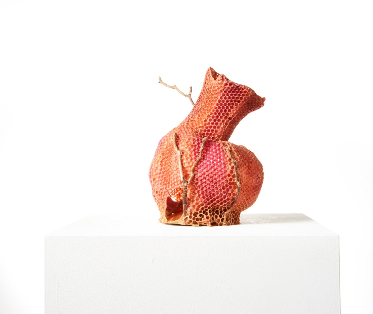 Eye makeup with eyeliner extending beyond the eyelid, featuring eyeshadow with glitter in shades of gold and red, set against blush on the cheek, with long eyelashes on an open eye.