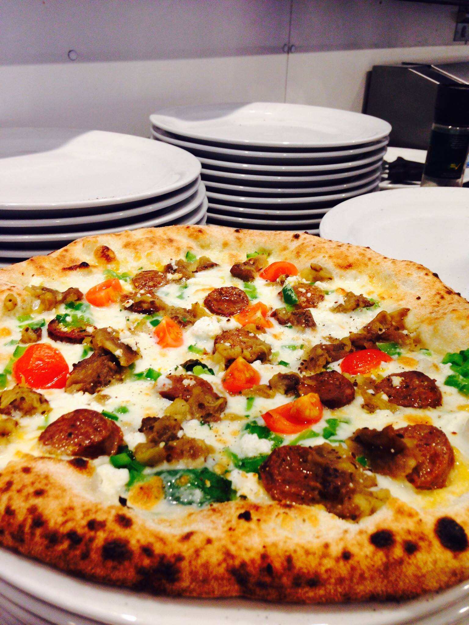 "text": "The shirt is tucked into the pants, which are visible beneath the jacket."