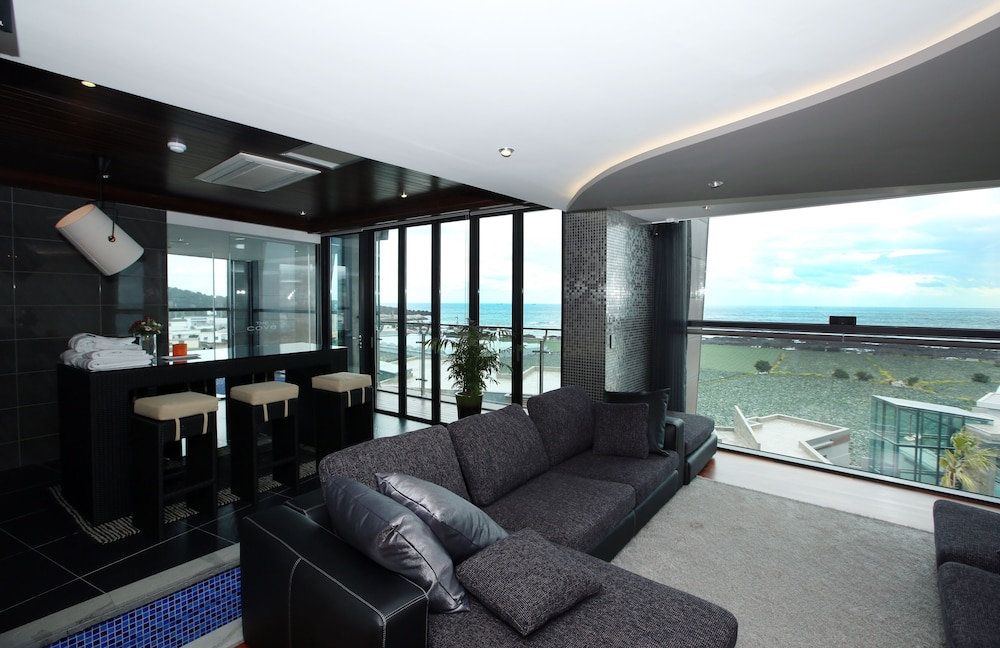 "text": "A person wearing a black leather jacket with a high collar. The jacket has visible stitching details and appears to be made from a smooth material."