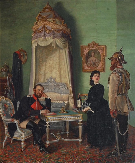 The image portrays a scene set in what appears to be a luxurious room with ornate decorations. In the foreground, there are three individuals engaged in what seems to be a social gathering or meeting. On the left side of the frame, there's a man dressed in a military uniform with red trimmings, suggesting he might be a high-ranking officer or royalty. He is seated on a white chair with intricate floral designs, holding a book or document in his hands. In front of him on a small table is a bottle with a label that reads "Wine" and a glass filled with wine, indicating he might be enjoying some refreshments during his reading or discussion. In the center of the scene stands a woman dressed in a black dress with a high collar, which could be indicative of her status or the formality of the occasion. She holds a tray with what appears to be a bottle of wine and two glasses, possibly offering refreshments to the other two individuals present.On the right side of the frame stands another man, who is dressed in what seems to be historical or period attire, possibly representing a knight or warrior due to his helmet with a crest on it. He holds a sword with a scabbard, suggesting he might be a warrior or someone with martial prowess. His attire and the presence of the sword indicate he might be from a different time period or representing a historical figure or character.The room itself is adorned with lavish decorations, including a large canopy bed with intricate designs, which occupies a significant portion of the background. Above the bed hangs a painting or portrait of a woman, adding to the room's opulence. The walls are painted in a light color with decorative patterns, and there's a chandelier hanging from the ceiling, contributing to the room's grandeur. The overall setting suggests a scene from a historical or fantasy narrative, possibly set in a time when nobility or royalty interacted with warriors or knights in such opulent surroundings.
