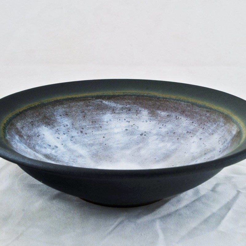 "text": "A woman stands in a room with a tray in her hands. She is dressed in a dark dress with a high collar and long sleeves. Her hair is styled up, and she wears a small brooch at her neckline. She appears to be looking down at the tray she holds."