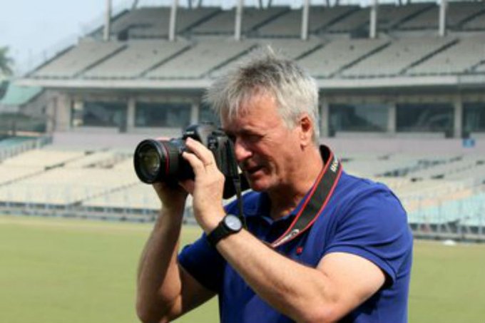 "text": "A person standing outdoors. They are wearing a white coat and have short hair. They are holding what appears to be a book or folder."