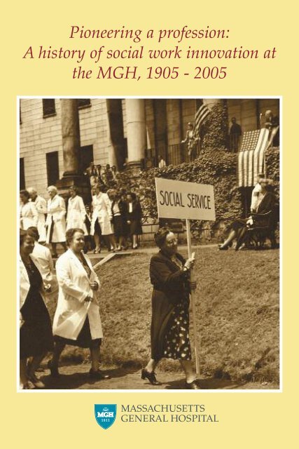 A group of people gather outside a building with columns, holding up signs advocating for social service or social work related issues during a peaceful demonstration from the mid-20th century.