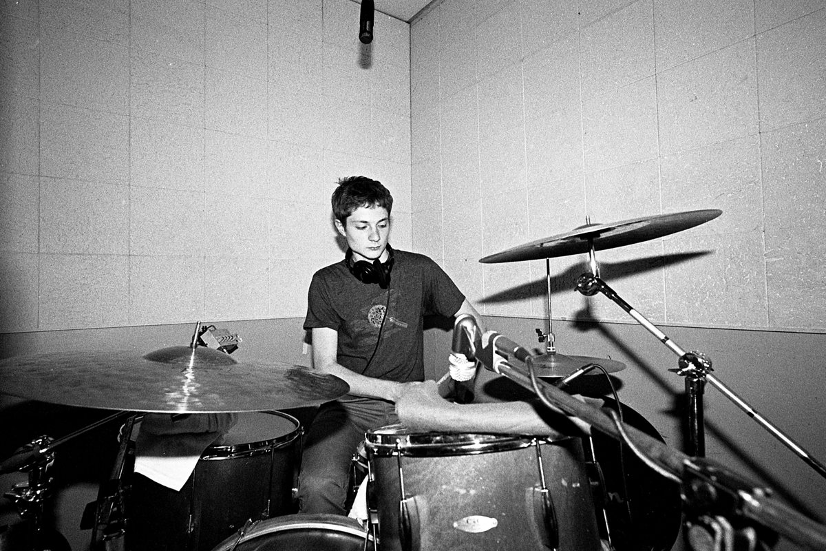 The image captures a young man engrossed in playing a drum set. He is seated on a stool, wearing headphones, which suggests he might be practicing or performing music. The drum set consists of several cymbals, including a large one on his left side and smaller ones on his right side. There are also two drums visible; one larger one on his right side and another smaller one on his left side. The man appears focused on his performance, indicating his dedication to his craft. The background features a plain wall with a tile pattern, providing a simple backdrop for the scene. The lighting suggests it might be late afternoon or early evening.