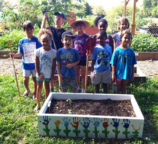 "text": "In the image, there is a young child standing outdoors. The child has curly hair and is wearing a white shirt with a graphic design. The child appears to be standing near a garden area with some plants visible."