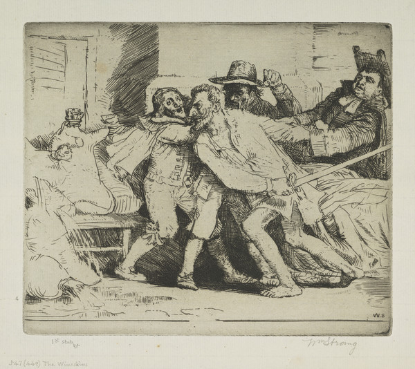 A stylized woman in a hat and dress with earrings extends her hand towards the viewer with her gaze directed towards her hand.