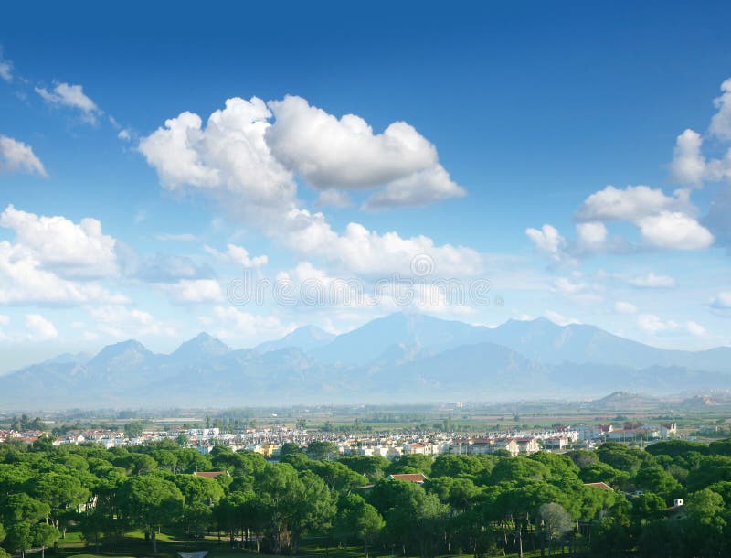 "text": "A tall, leafy tree with a thick trunk stands prominently in the foreground. Its branches are lush with green leaves, and it appears to be in full bloom."