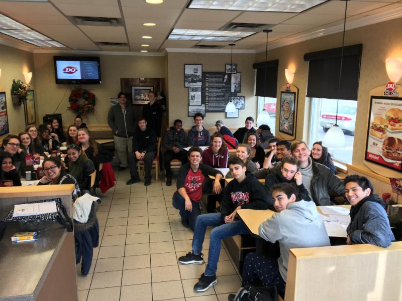 "text": "A young girl with a radiant smile is holding up a clapperboard. She is wearing a purple top and has her hair styled."
