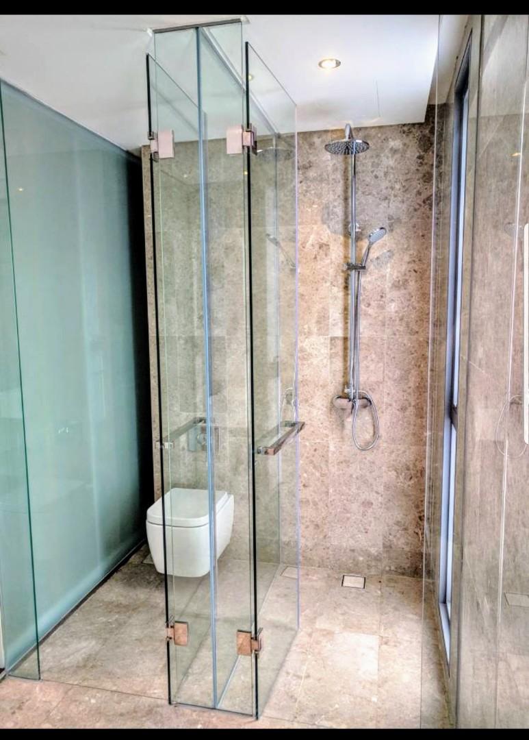 The image presents a modern bathroom interior with a clean and minimalist design. The bathroom features a glass shower enclosure with a clear glass door and walls, allowing for transparency while maintaining separation from the rest of the room. Inside the shower, there's a silver showerhead mounted on the wall, along with a handheld showerhead attached to a flexible hose for convenience. The shower floor has small, square tiles laid out in a grid pattern, providing a sleek appearance. Adjacent to the shower, there's a toilet with a white tank and bowl, positioned against the wall. The toilet has a simple design with no visible flush buttons or controls, suggesting it might be a modern, automatic model. Above the toilet, there's a towel rack mounted on the wall, ready for use. The walls of the bathroom are adorned with large, rectangular tiles that give the space an elegant and contemporary look. The lighting in the bathroom appears soft and ambient, contributing to the overall serene atmosphere.