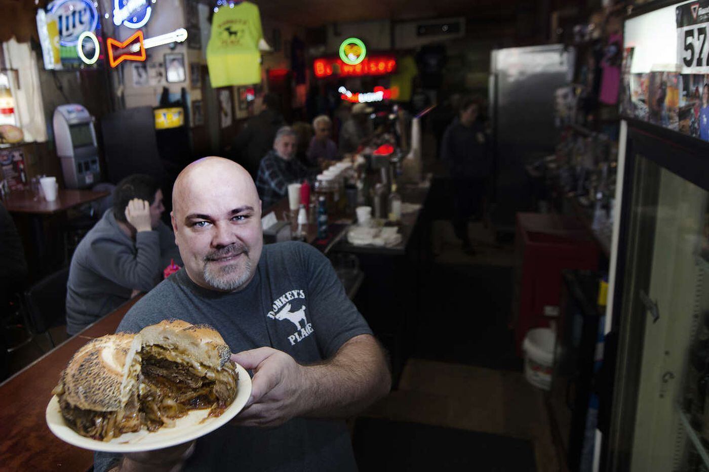 "text": "<PERSON>, third-generation owner of <PERSON>'s Place in Camden, shows off a signature <PERSON>'s cheesesteak at the bar-restaurant's Haddon Avenue location."