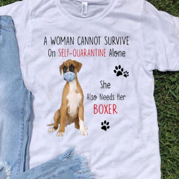 "text": "A t-shirt with a cartoon dog wearing a mask on a white surface with a paw print, featuring black text stating \"A woman cannot survive on self-quarantine alone\" followed by \"She also needs her boxer\"."