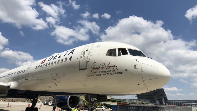 "text": "A Delta Airlines airplane with registration number \"N616\" parked on tarmac under sky with signature \"Joseph E. Lowery\" dedicated to Civil Rights Movement."