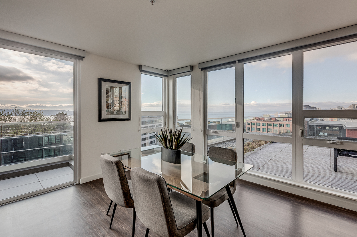 "text": "The image features a man standing confidently with his hands on a table. He is wearing a black coat over a black shirt, paired with black pants. His attire suggests a formal or professional setting. The man has a bald head and is wearing sunglasses, which adds an air of mystery or authority to his appearance. In the background, there's a large window with blinds partially drawn, allowing for natural light to enter the room. The window offers a view of a cityscape with buildings under a clear sky. The overall setting appears to be an office or corporate environment."