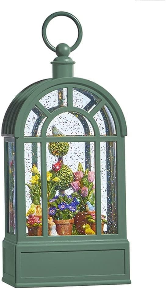 Lighted Green Gazebo Water Lantern with Birds, Topiary, Rabbits and Flowers Amid Swirling Glittered Water Effect, Easter Lighted Water Lantern with Timer, 10.25 Inches, Battery Operated