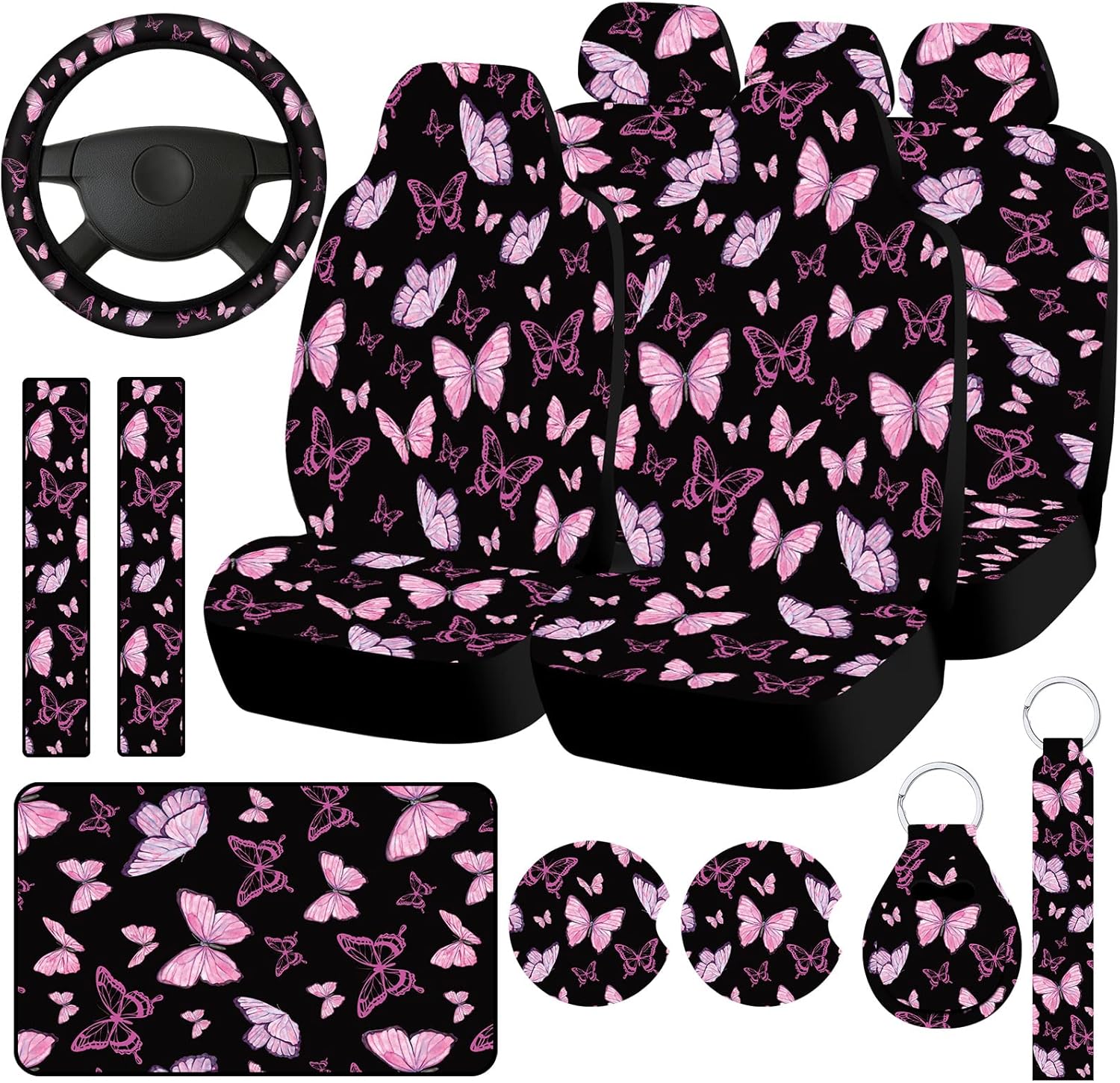 15 Pcs Colorful Print Car Seat Covers Full Set Front and Rear Bench Protector Front Seat Rear Backrest Cover Steering Wheel Cover Seatbelt Pads Armrest Cover for Van Truck SUV (Butterfly)