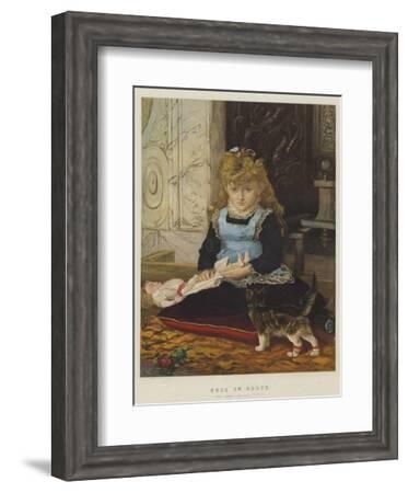 A delightful scene depicts a charming little girl and her feline friend, both of whom appear to be savoring each other's company, as they sit together on the floor, surrounded by a vintage portrait beautifully presented in a frame.