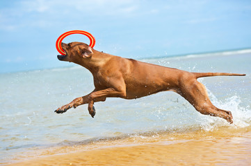 Happy dog rhodesian ridgeback running with frisbee at the beach | 361 | 240 | |