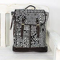 Leather accent cotton blend backpack, 'Geometric Explorer' - Leather Accent Cotton Blend Backpack in Black and White | 200 | 200 | |