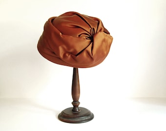 Satin Turban Hat, 1960s Glam Fashion, Copper Boho Accessories, Sheppard of New York, Orange Brown Turban, Mid Century Women Fashion, 1960s | 340 | 270 | |