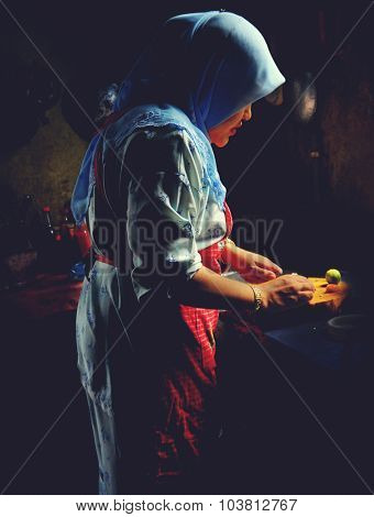Malaysian Lady Sunlight Prepare Food Kitchen Concept | 340 | 470 | |