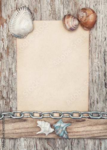 Old paper, seashells and metal chain on the old wood | 359 | 500 | |