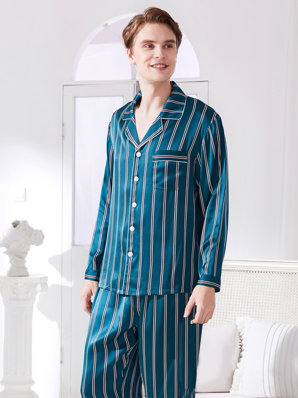 High Quality 19 Momme Peacock Blue Stripes Long Sleeves Silk Pajamas Set For Men、Real Silk Life | 384 | 511 | |