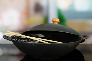 Black wok pan on kitchen oven, close up | 360 | 240 | |