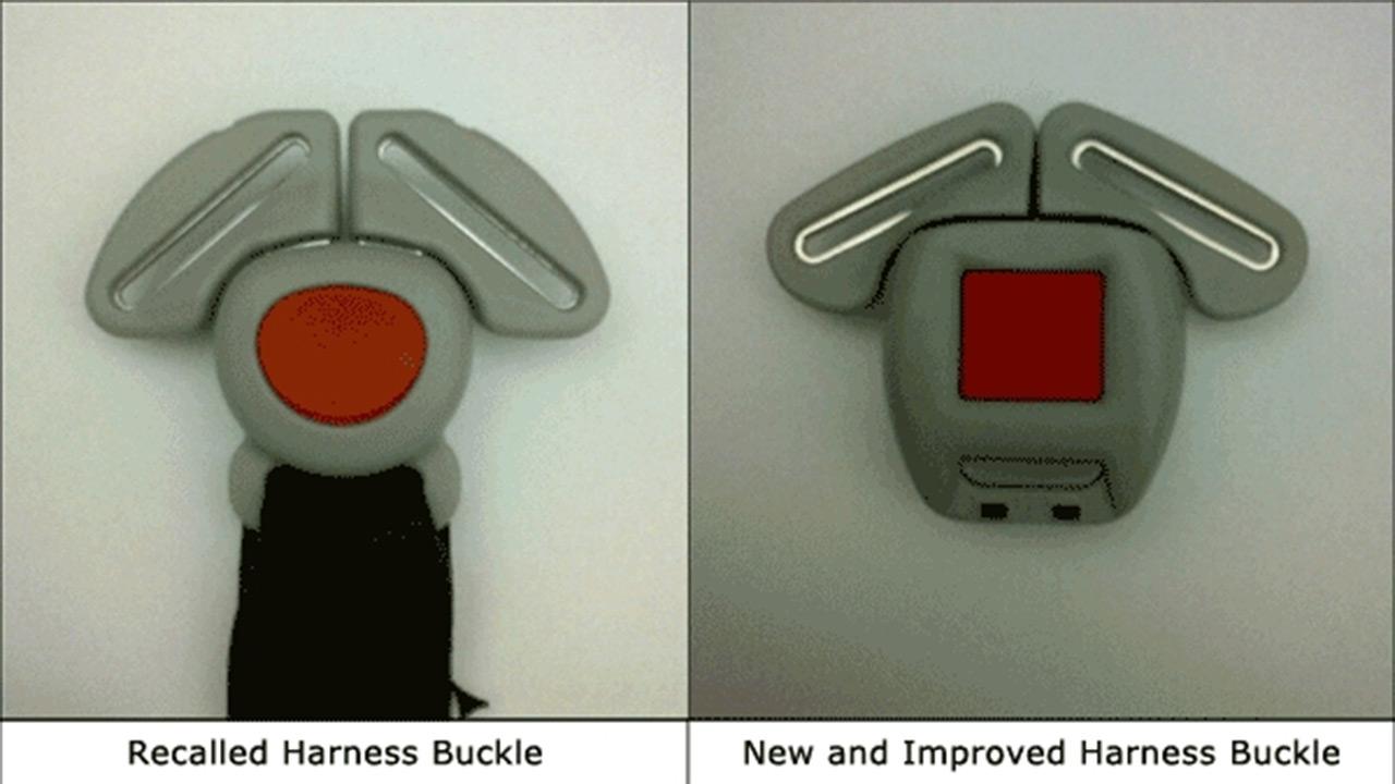 Graco is recalling nearly 3.8 million child car seats because children can get trapped by buckles that may not unlatch. The company provided these photos to consumers to show the recalled buckle and the new buckle that is available for replacement. | 682 | 384 | |