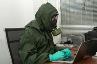 Bloke in office wearing hazmat suit | 198 | 131 | |