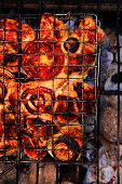 grilling spiced chicken in grid on charcoal bbq with tomatoes and vegetables | 113 | 170 | |