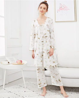 Leaf Print Cami Pajama Set Female Three-piece Robe Gown Sets | 265 | 331 | |