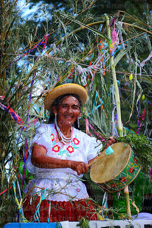 Elderly woman in traditional dress playing caja (drum) at carnival parade, Tarija, Bolivia | 300 | 450 | |