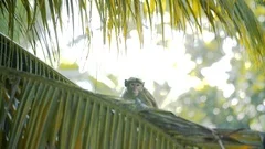 A funny monkey sits on a palm branch and eats in summer Stock Footage | 240 | 135 | |