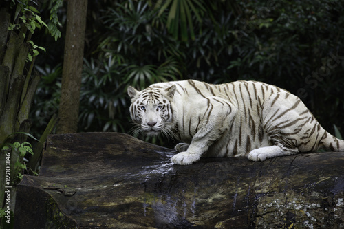 Fotobehang Tijger Tiger in a jungle. White Bengal tiger on tree trunk with forest on background | 500 | 333 | |