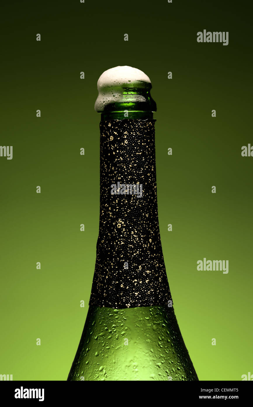Cold wet bottle of champagne with Froth - Stock Image | 384 | 616 | |
