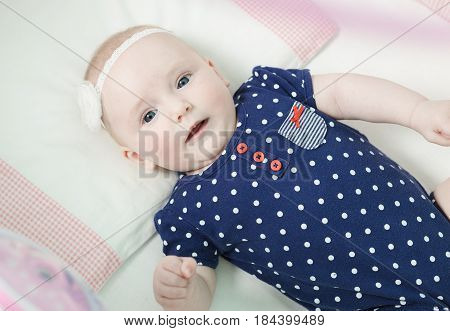 Infant lies on her back in a baby crib. Baby is dressed in a suit for babies. | 450 | 331 | |