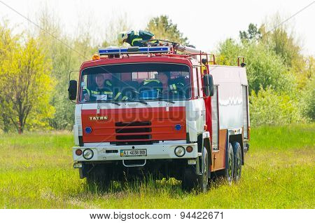 BORYSPIL, UKRAINE - MAY, 20, 2015: Red firetruck Tatra ride on call fire suppression and mine victim | 450 | 318 | |